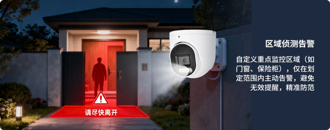 自定义重点监控区域(如门窗、园区周界),仅在划定范围内主动告警,避免无效提醒,精准防范。
